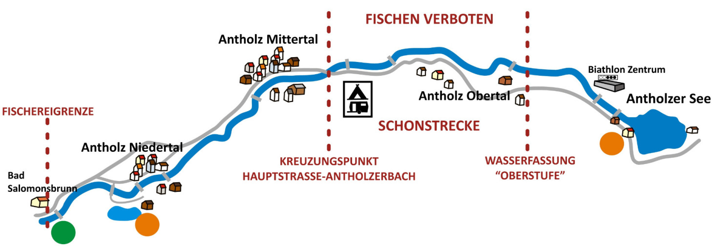 Das Fliegenfischer-Revier (Abschnitt Nr. 158) umfasst 3 Strecken. Das untere Revier: (ca. 5,5 km) beginnt an der Brücke beim Hotel Bad Salomonsbrunn, erstreckt sich über Antholz Niedertal bis hinauf nach Antholz Mittertal und endet mit der oberen Grenze am Kreuzungspunkt Hauptstraße/Bach oberhalb des Ortes. Ab hier bachaufwärts bis Wasserfassung Antholz „Oberstufe“ verläuft eine Schonstrecke (ca. 2,8 km), in der das Fischen absolut verboten ist!