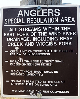 Aufgrund der unzähligen Flüsse und Seen, in denen unterschiedliche Vorschriften gelten, werden im Wyoming Fishing Guide: "www.wgfd.wyo.gov/fishing-and-boating" alle zulässigen Arten der Fischerei an Flüssen und Seen genau und ausführlich beschrieben. Dass man dort, wo für einige Spezies Catch&Release gilt, immer widerhakenlos fischt, ist eine Selbstverständlichkeit!